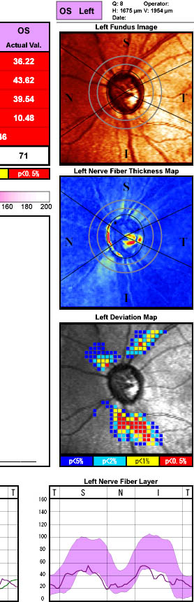 GDx VCCでは、検眼鏡的に見える部位のみでなく、全体的に視神経線維層が薄くなっているのがわかる。