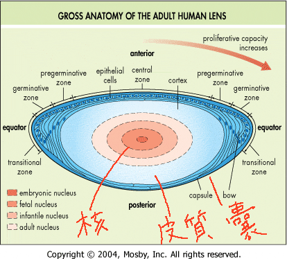水晶体は次の3つの部分からなっています。 1.水晶体を包んでいる袋 2.皮質(やわらかい部分) 3.核(硬い部分)nucleus |